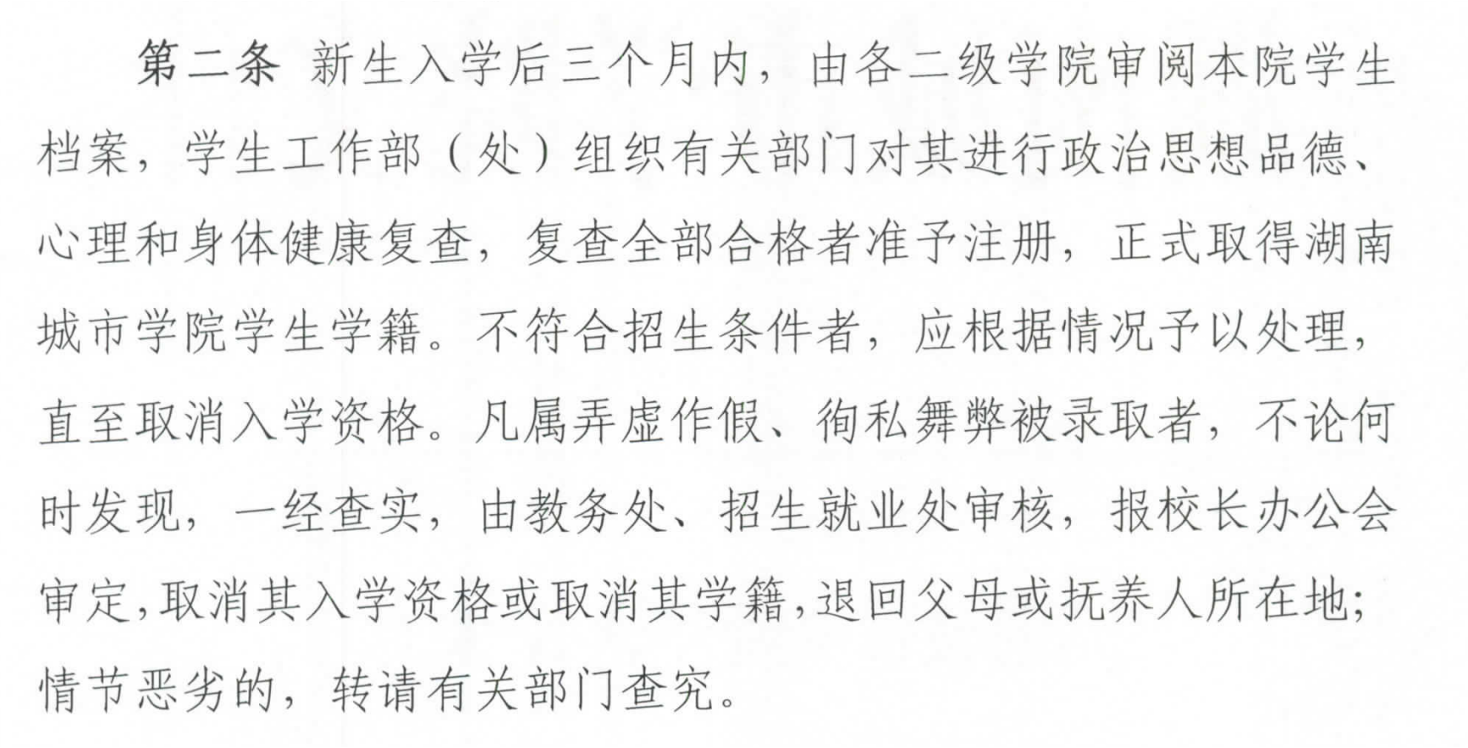 第八条 新生入学后,学校在三个月内按照国家招生规定对其进行复查。复查合格者予以注册,取得学籍。复查不合格者,由学校区别情况,予以处理,直至取消入学资格。