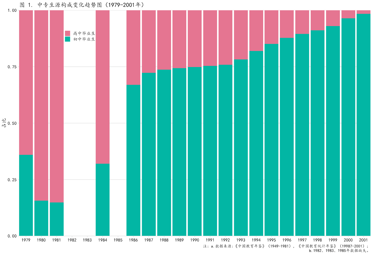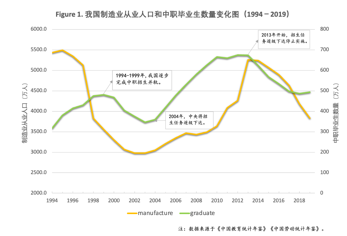 教育部 劳动人事部 财政部 国家计委关于改革城市中等教育结构、发展职业技术教育的意见(1983年) “力争到1990年,使各类职业技术学校在校生与普通高中在校生的比例大体相当。”