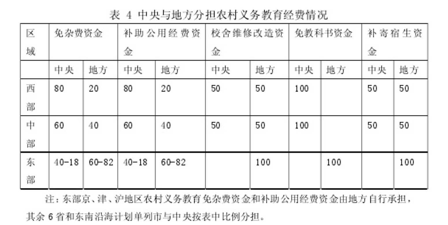 对西部 11 个省(陕西、甘肃、新疆、广西、四川、云南、重庆、宁夏内蒙古、青海、贵州)来说,教科书资金由中央财政全额承担,免学杂费和提高公用经费资金中央承担 80%,地方承担 20%。校舍维修改造资金中央承担 50%,地方承担 50%。家庭经济困难寄宿生的生活费补助,地方财政承担 50%,中央财政照 50%的比例给予奖励性补助。