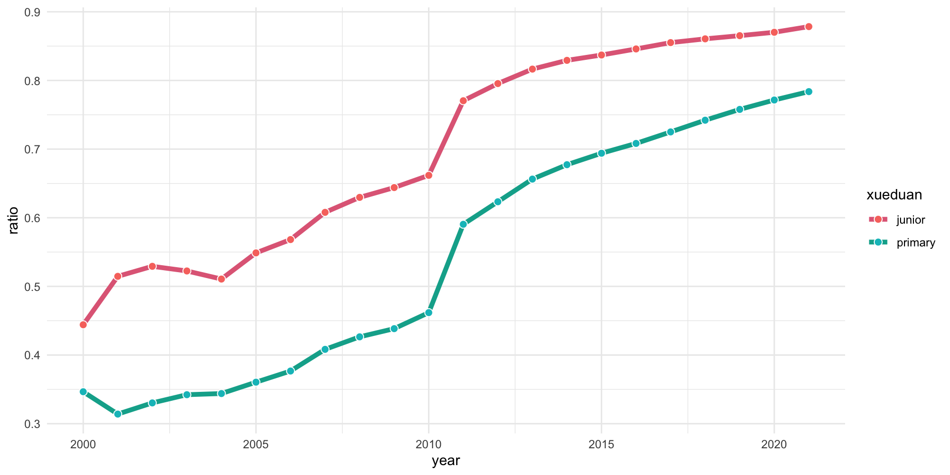 这一时期教育政策的价值重心又逐渐由”普及”转向了”提高”,自 1978 年开始至此后的 80年代,教育改革的重点放在了重建高等教育以及为考大学做准备的”重点”中小学的建设上,农村地区的学校被大幅度地撤消或合并,教育资源开始向”重点”和城市集中,农村小学由 1977 年的 94.9 万所减少到 1985 年的 76.6 万所,农村中学(包括初中和高中)也从 18.2 万所减少到不足7万所,分别减少了19.3%和62%;而同期城市和镇的小学则从 3.3 万所增加到 5.7 万所,中学从 1.9 万所增加到近 2.4 万所,分别增加了72.7%和26.3%。