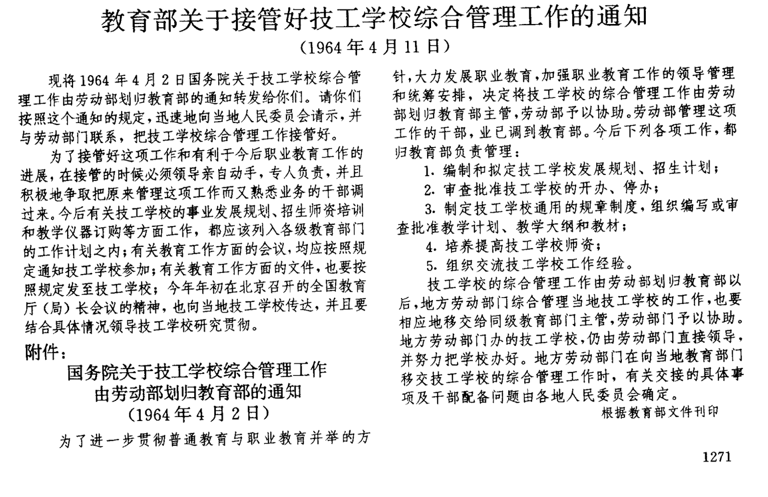 中等教育结构改革,主要是改革高中阶段的教育,要使高中阶段的教育适应社会主义现代化建设的需要,应当实行普通教育与职业、技术教育并举,全日制学校与半工半读学校、业余学校并举,国家办学与业务部门、厂矿企业、人民公社办学并举的方针,县以下教育事业应当主要面向农村,为农村和各项建设事业服务。在城乡要提倡各行各业广泛办职业(技术)学校。可适当将一部分普通高中改办为职业(技术)学校、职业中学、农业中学。经过调整改革,要使各类职业(技术)学校的在校学生数在整个高级中等教育中的比重大大增长。