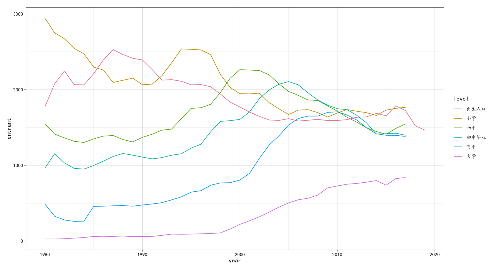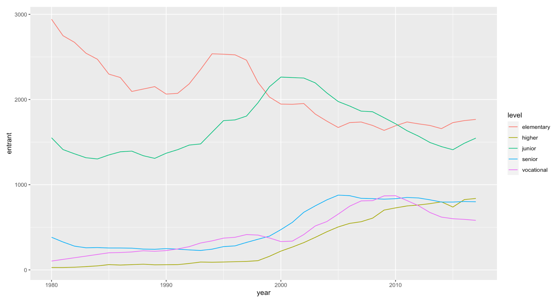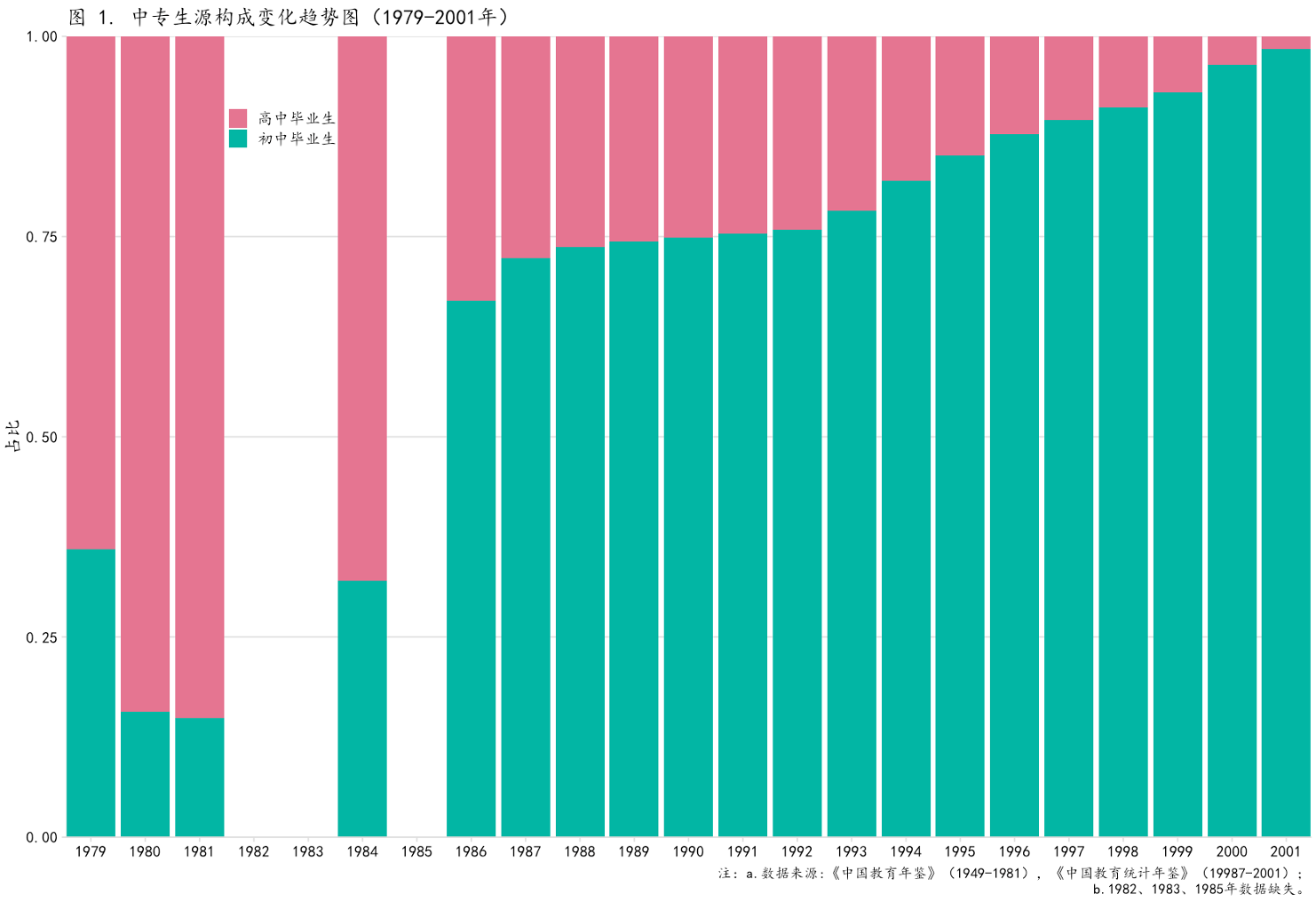 1965年,普通高中在校生人数为130.8万,中职学校在校生人数为142.3万,其中,中专学校在校生为54.7万,技工学校在校生为10.1万,农业高中和职业高中在校生为77.5万,职业教育在校生占高中阶段在校生的52.1%。 但职业教育在文革中遭到批判,大量职业学校停办,1978年,各类职业教育学校在校生人数只占高中阶段在校生人数的1.16%,高中阶段的普通教育与职业教育严重失衡,当时高中毕业生升大学的也较低,1980年只有4%,因此,迫切需要调整中等教育结构。