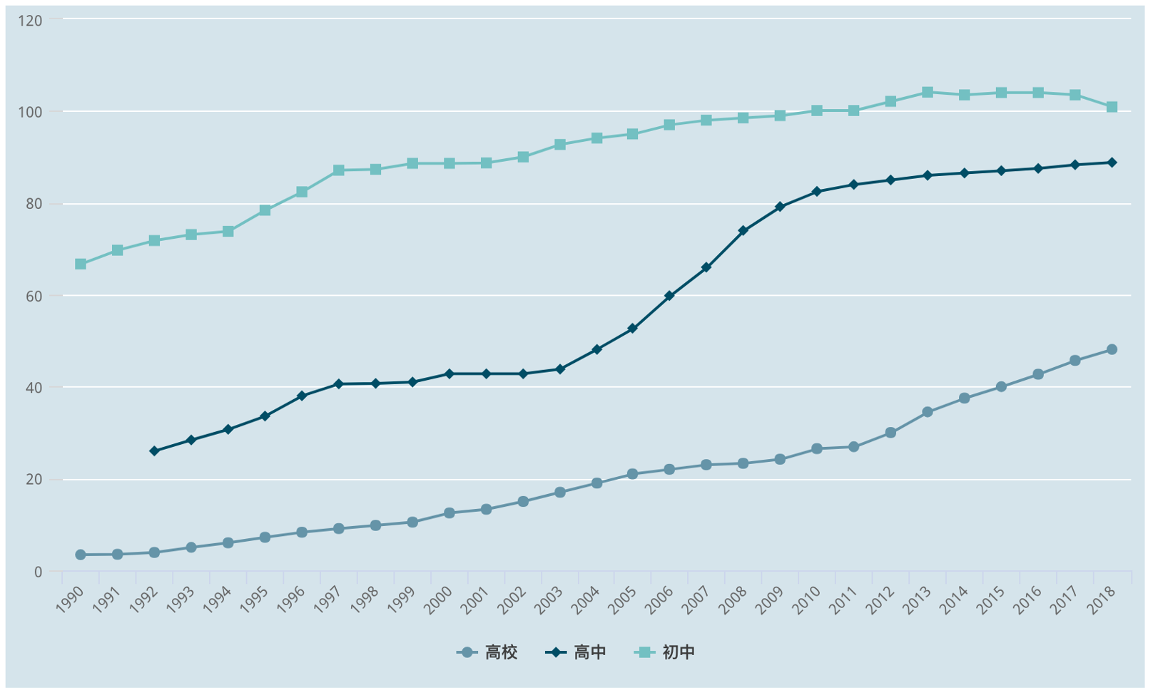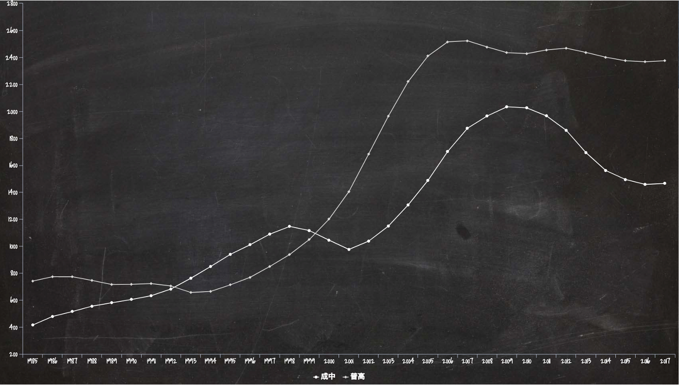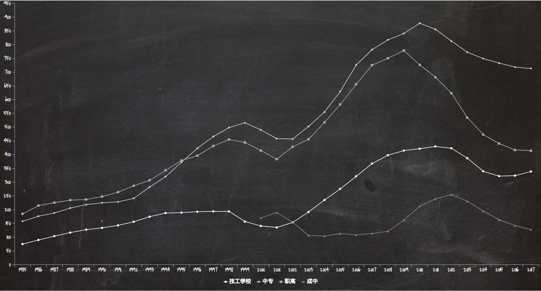 “力争到1990年,使各类职业技术学校在校生与普通高中在校生的比例大体相当。”