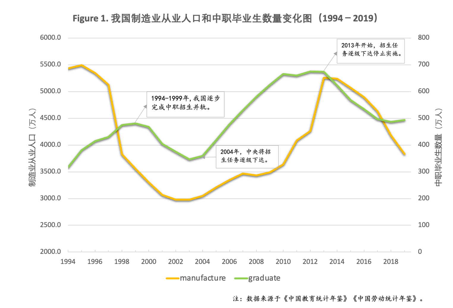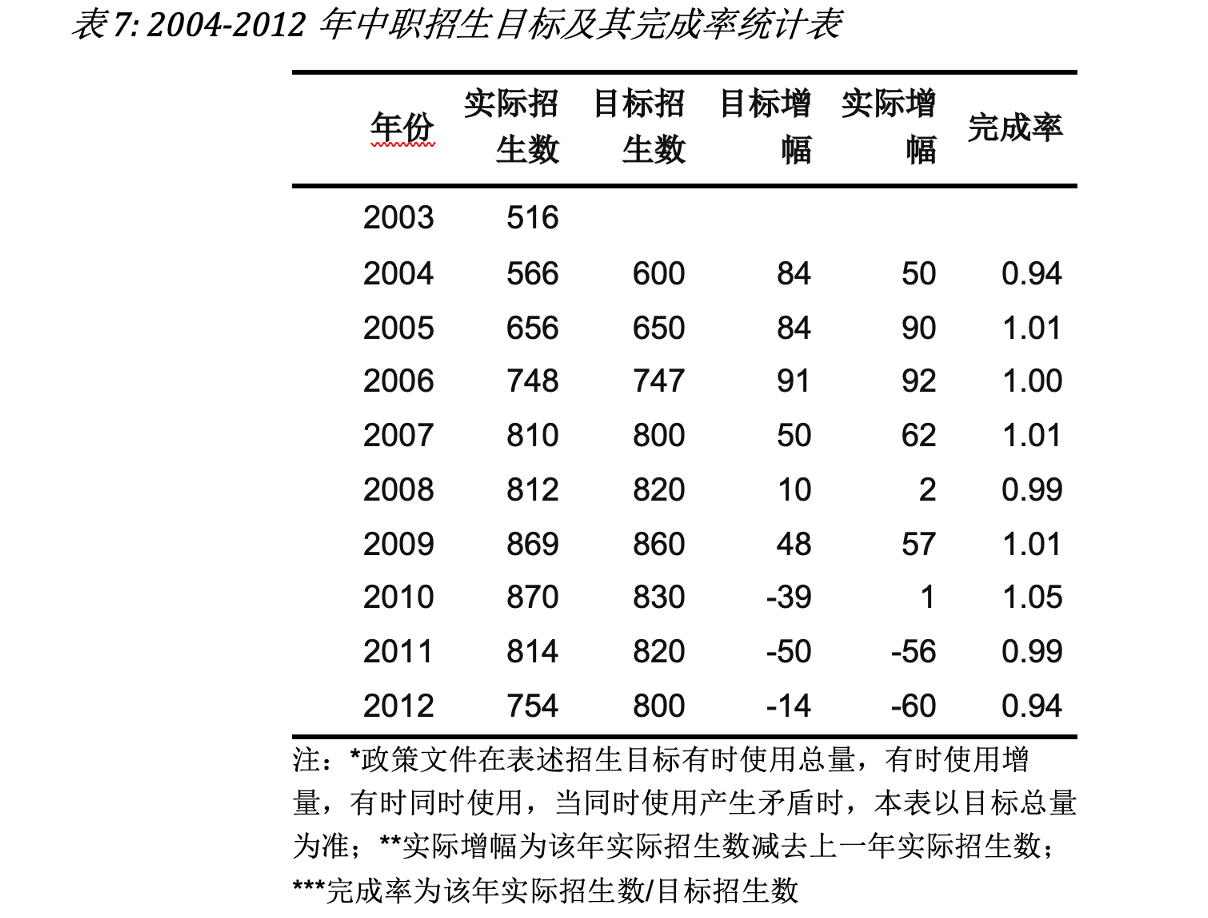 2004年中职招生政策重新开始实施规模调控,该阶段与1994年前指令性招生计划管控不同,中央政府不再是限制中职的招生规模,而是竭力促进招生规模的增长。每年确定招生总量目标,并将其分配到各省,督促各省完成相应招生任务。