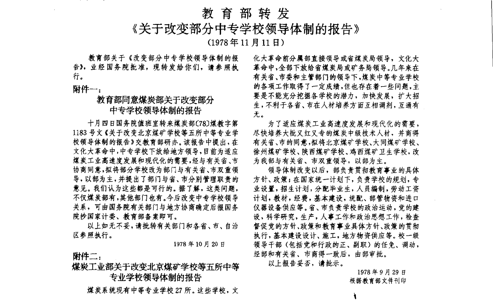 1980年国务院批转民政部、教育部《关于对中等专业学校毕业生进行统一调剂的报告》规定中专毕业生原则上由各部门和各省自行分配,必要时国家根据需要作少量调剂。